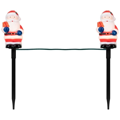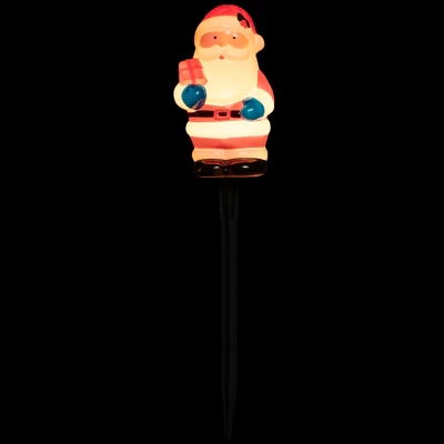 Brighten your holiday walkway with these Lighted Santa Claus holiday pathway markers! Each 16″ marker on green wire is pre-lit with a clear incandescent C7 bulb, totaling 4 Santa markers in the set. With 18″ spacing between Santas and UL certification for safe outdoor use, these markers bring festive cheer to any path. The reliable design ensures that if one bulb burns out, the rest stay lit. Connect multiple sets easily with end-to-end connectors, and secure each Santa with a sturdy black lawn stake. A perfect choice for a magical holiday display!Product Features:Lighted Santa Claus holiday pathway markers – 4-packBulb color: clearNumber of bulbs per Santa Claus: 1Number of bulbs throughout set: 4Bulb size: C7Bulb type: incandescentSpacing between each Santa Claus: 18″Lighted string length: 4.5’Total string length: 7’24” green lead cord6″ tail cordAdditional Product Features:UL certified and approved for outdoor useIf one bulb burns out, the rest will stay litEnd-to-end connectors allow you to connect multiple sets together (not to exceed 210 watts)Dimensions:.Overall lawn stake dimensions: 16″H x 4″W x 3″DSanta Dimensions: 6″H x 4″W x 3″DStake Dimensions: 9.75″ highMaterial(s): plastic/wire